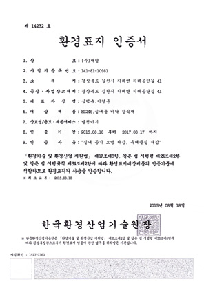 ECOLEUM 환경표지인증서 (14232호) 页面信息 作者 admin 查询 发布时间2020-07-01 15:46:32 본문 列表 上一篇:환경표지인증서 (14231호) 2020-07-01 下一篇:친환경건축자재인증서 2020-07-01